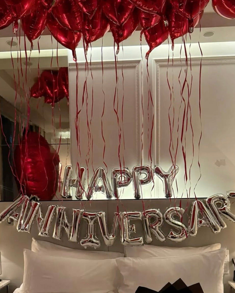 Premium rose petals, luxury candles, elegant decorations, and a decorative balloon arrangement are included in the package.